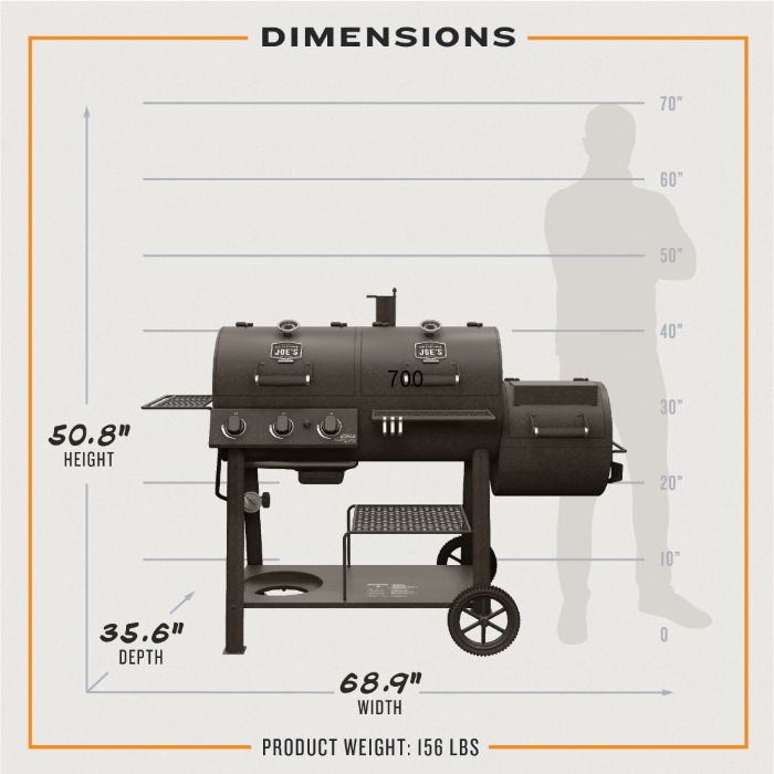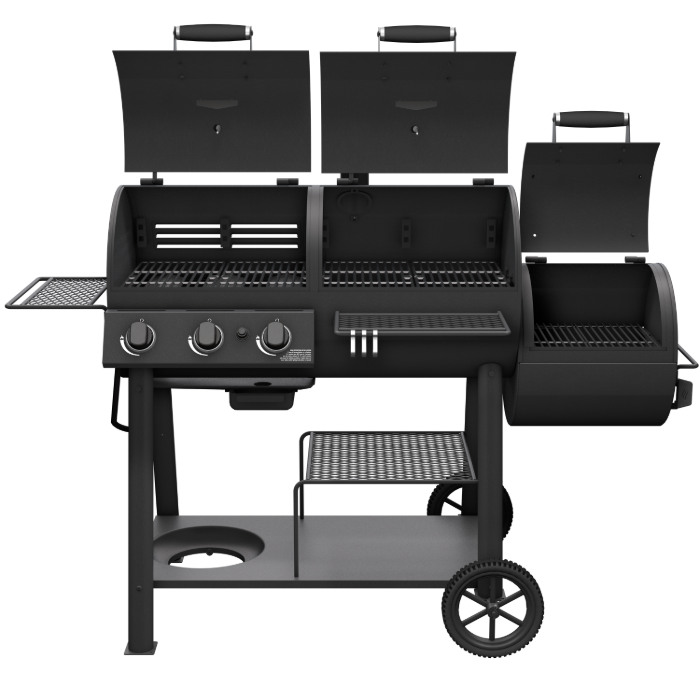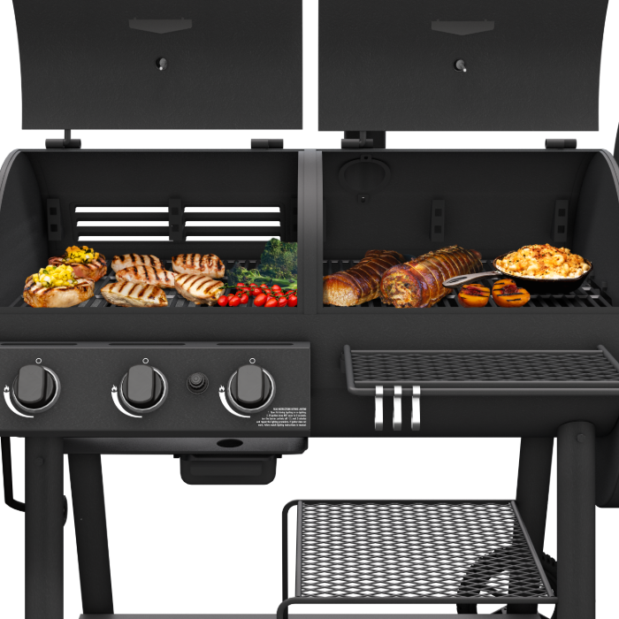 The Oklahoma Joe’s® Canyon Combo Charcoal/Gas Smoker & Grill delivers the real smoke flavour you crave alongside the chargrilled taste you love. Cook a juicy steak low and slow on the smoker, then finish it with a quick reverse-sear on the gas grill—or, if you’re hungry now, just fire up the gas side and start cooking right away. Redesigned to enhance your smoking and grilling experience, the Canyon Combo now features pivoting cool-touch handles, an easy-access ash pan, and rubber treads on the wheels. It also includes tool hooks, a charcoal basket, and a robust staging shelf to make every cookout smoother and more convenient.